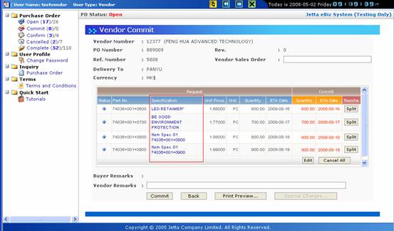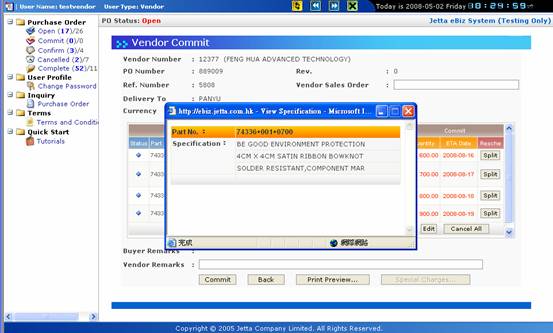 按下貨品規格說明 (Specification) 來查看貨品的詳細規格